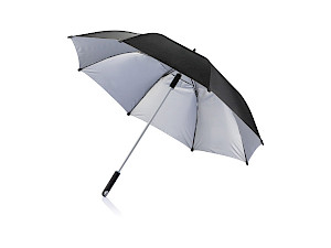 Automaattisesti aukeava suorakahvainen rPET Sateenvarjo upealla monivärisellä painatuksella. Varjo-osa on tehty kierrätetyistä juomapulloista ja kahva on pehmeää EVA-materiaalia. Varjossa on tyylikäs musta metallirunko ja mustat ruoteet. Sateenvarjo voidaan painaa sublimaatiopainatuksella valokuvamaisesti.