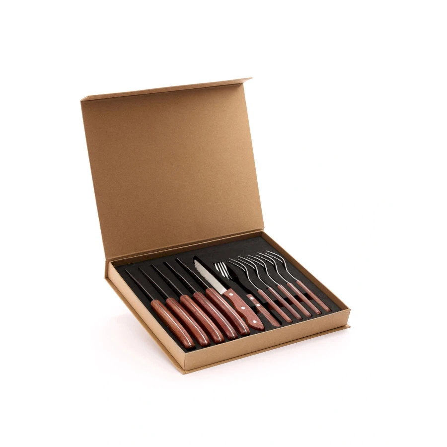 Kestävät ruusupuiset ruokailuvälineet pakkapuukahvoilla yhdistävät luotettavuuden ja tyylin. Kahvat on valmistettu kulutusta ja kousteutta kestävästä pakka-puusta. Ruokailuvälineet tarjoavat mukavan ja vakaan otteen sekä tuovat jokaiseen ateriaan elegantin ja modernin ilmeen. Setissä kuusi terävää pihviveistä ja kuusi haarukkaa tyylikkäässä lahjapakkauksessa.