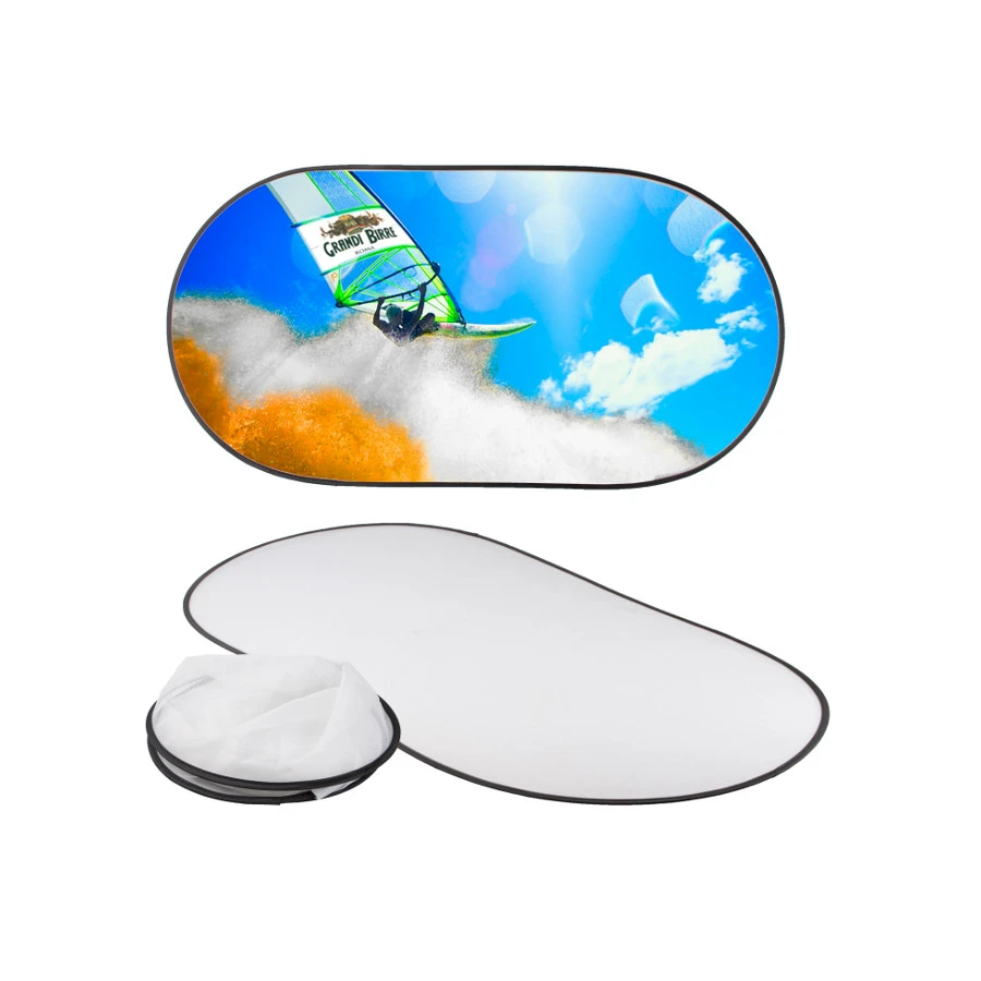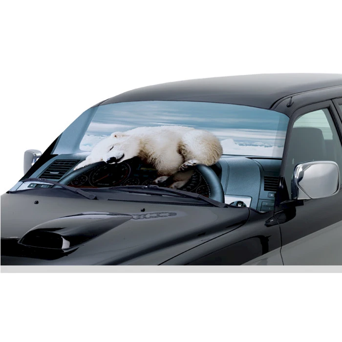 Auton tuulilasiin sisäpuolelle asetettava aurinkosuoja. Aurinkosuoja suojaa ja estää aurinkoa kuumentamasta auton istuimia ja hallintalaitteita. Sopii kaikkien autojen tuulilaseihin. Suojan saa käännettyä kiepille ja painettua kasaan, jolloin se saa suljettua samasta kankaasta valmistettuun säilytyspussiin. Suoja on valmistettu kevyestä ja kestävästä polyesteristä. Monivärinen painatus aurinkosuojaan on näyttävä ja näkyvä paikka mainosviestille. Painatus voidaan vaihtoehtoisesti tehdä silkkipainatuksena säilytyspussiin.