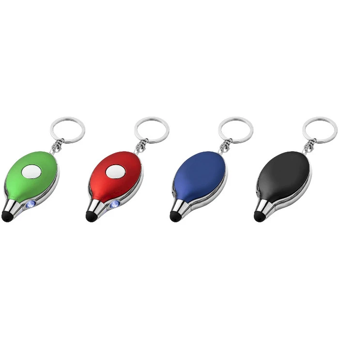 LED-avaimenperä, jossa on kirkas valkoinen LED-valo ja stylus-kosketusnäyttökärki mobiililaitetta varten. Mukana paristo. Virtapainike takana. ABS-muovi. Väreinä musta, sininen, punainen, lime.Pyydä tarjous omasta määrästä ja logopainatuksesta.
