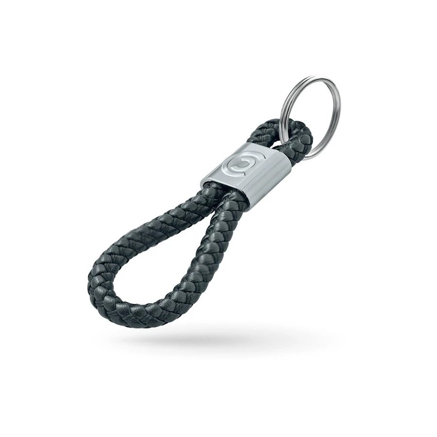 Avaimenperä punottua aitoa nahkaa ja ruostumatonta terästä. Logomerkkaus metalliosaan.