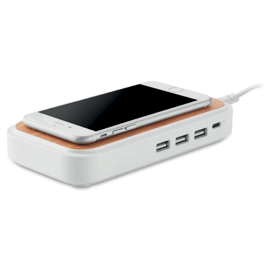 Bamboo 5V langaton laturi 4 USB-portilla. Lataus toimii langattomasti asettamalla matkapuhelin alustalle. Vihreä valo on päällä kun laite lataa. Lähtöteho: DC5V/1.0A.Laite toimii kaikkien QI-laitteiden kanssa kuten Android, iPhone® 8,8S ja uudempien kanssa.