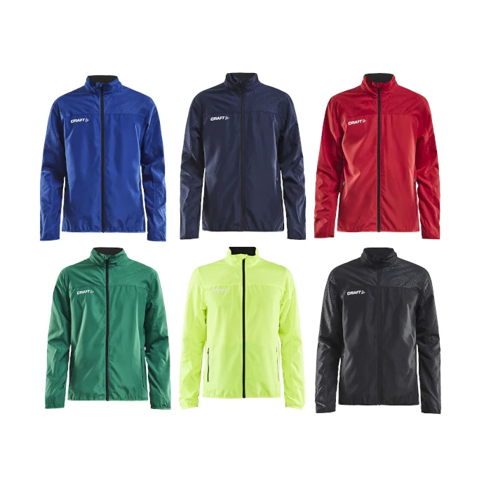 Craft Rush Wind -tuulitakki. Kevyt ja toiminnallinen tuulitakki woven-kankaasta, joka tarjoaa erinomaista kosteudensiirtokykyä ja hengittävyyttä. Kaksi vetoketjullista sivutaskua. Takki on erittäin kevyt ja tuulenkestävä. Soveltuu loistavasti seura-, sponsori- sekä yrityslogopainatuksiin. Miehielle, naisille ja Junioreille omat mallit.Värit: Club Cobolt sininen, Navy, Bright Red, Team Green, Flumino, BlackMateriaali: 100% polyesteri