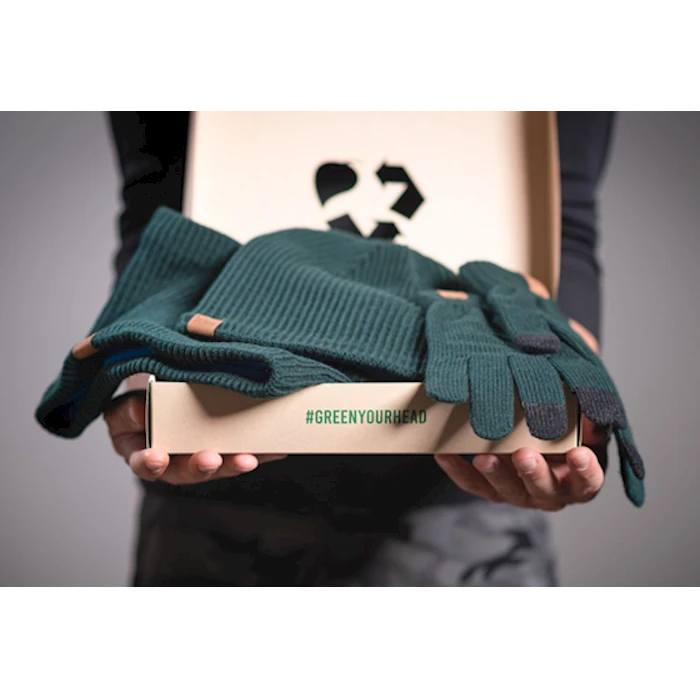 Lahjasetti sisältää osittain kierrätyspolyesterista valmistetun pipon, kaulurin ja sormikkaat. Kaulurissa ja pipossa 1x2 ribbineulos. Sormikkaat toimivat kosketusnäytöillä. Tuotteet ovat mahdollista logomerkata brodeerauksella tai tekonahkamerkillä. Lahjapakkaus kierrätysmateriaalista. Värit: useita värivaihtoehtoja. Kauluri: päälliosa 50% akryyli / 50% kierrätyspolyesterivuori 15% polyesteri / 85% kierrätyspolyesteri