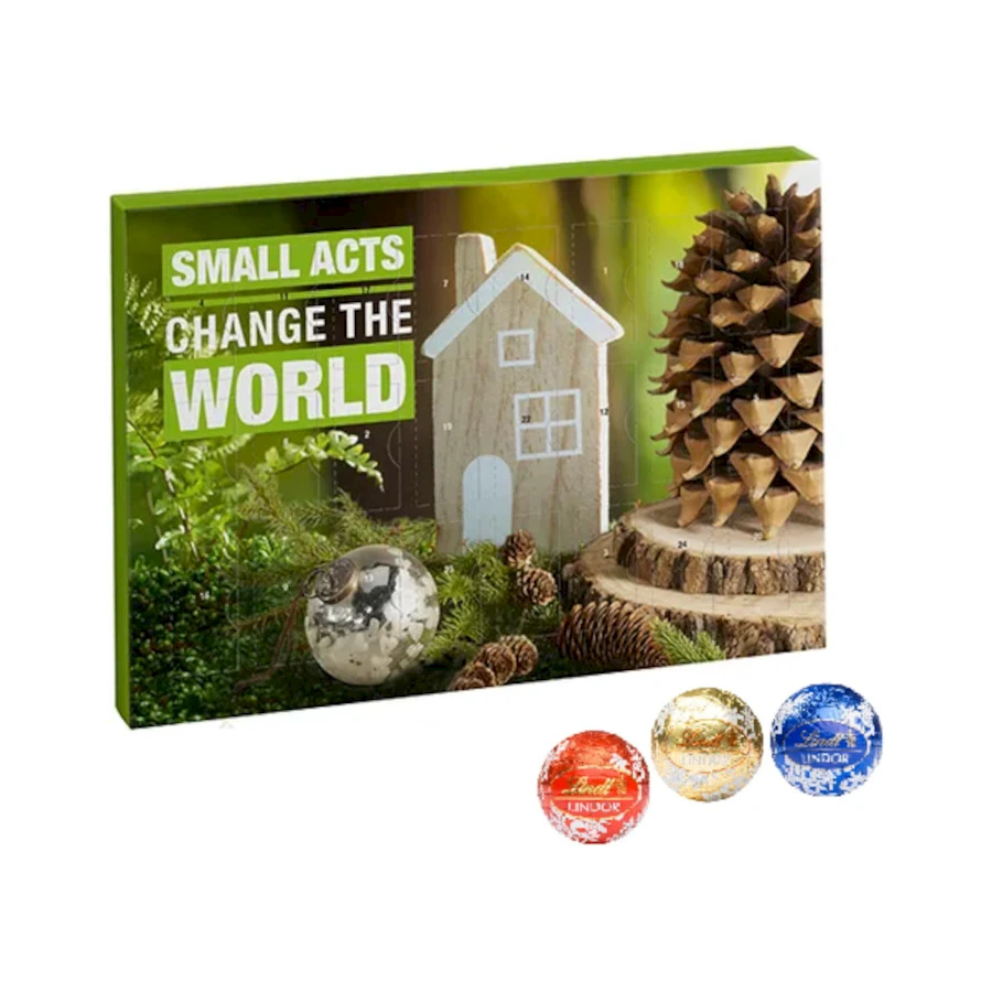 Eko Lindor Praliné suklaajoulukalenteri. Adventtikalenteri on valmistettu FSC-sertifioidusta kartongista ja se on täysin muoviton ja 100 % kierrätettävä. Sopii seinäkalenteriksi ja pöytäkalenteriksi. Suklaajoulukalenterin sisällä 24 Lindt Lindorin maitosuklaa, valkosuklaa ja tummasuklaata. Säilyvyys 6 kk. Joulukalenteri Lindt voidaan toteuttaa omalla aineistolla.