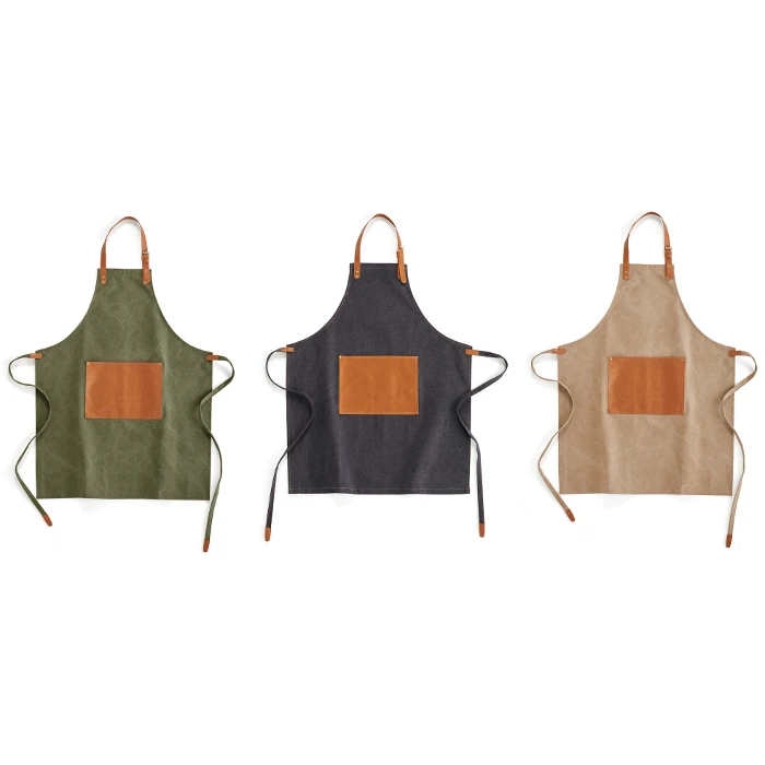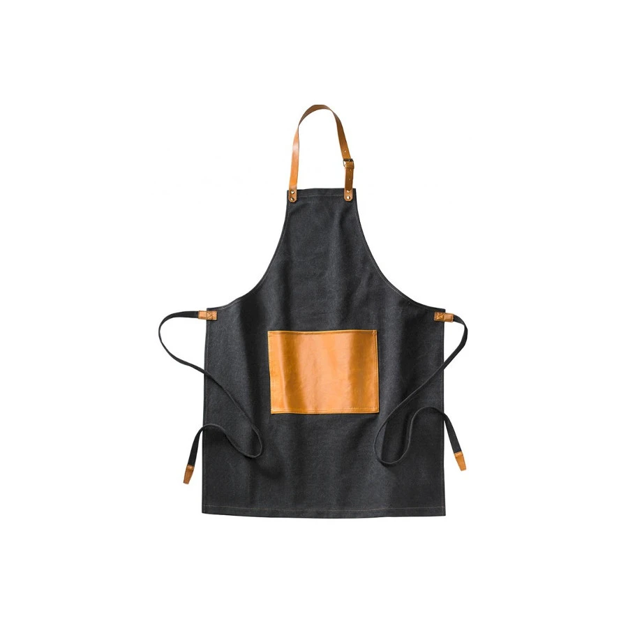 Farkkukankainen esiliina kivipestystä 45 g/m² kanvaasista. Vahvassa esiliinassa tekonahkainen tasku, säädettävä kiristysnauha ja koristeet antavat essuun ilmettä. Koko 70 x 90 cm. Pakattu muovipussiin.
