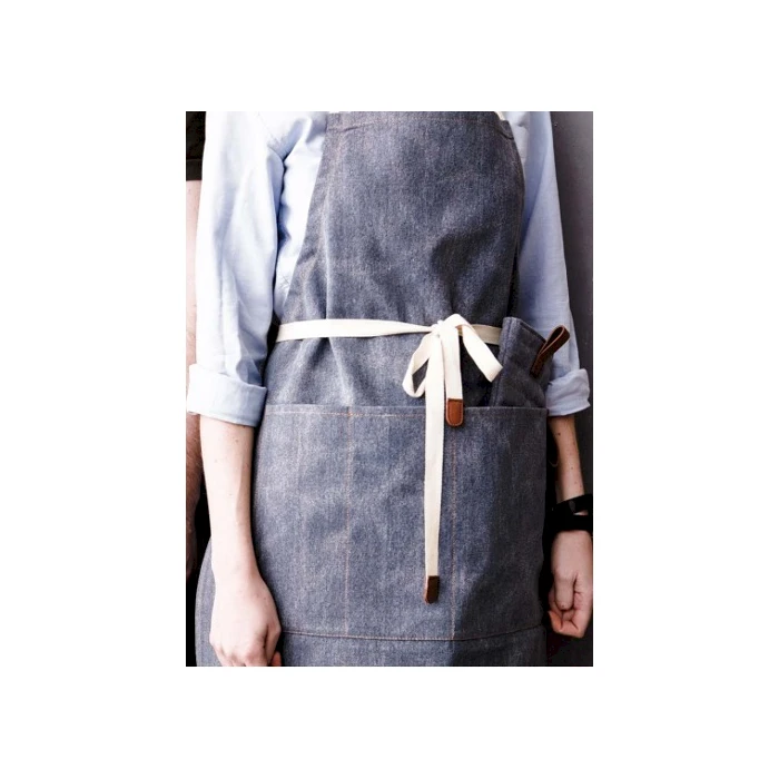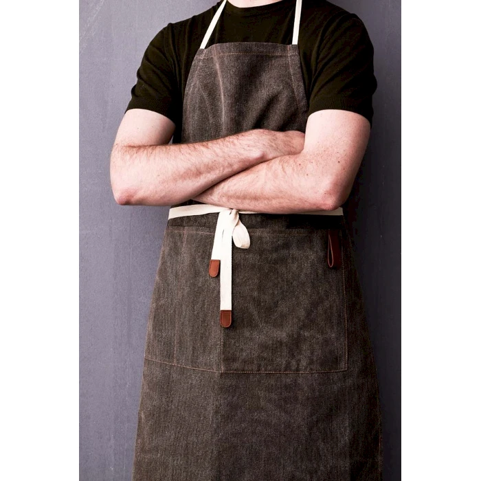 Puuvillakanvaasista tehty esiliina, jossa kivipesuefekti. Esiliinassa säädettävä kaula-aukko, etutaskut ja tyylikkäät keinonahkaiset yksityiskohdat. Taskuihin voit laittaa vaikka mausteet tai ottimet. Säädettävä esiliina sopii monen kokin kaulaan.