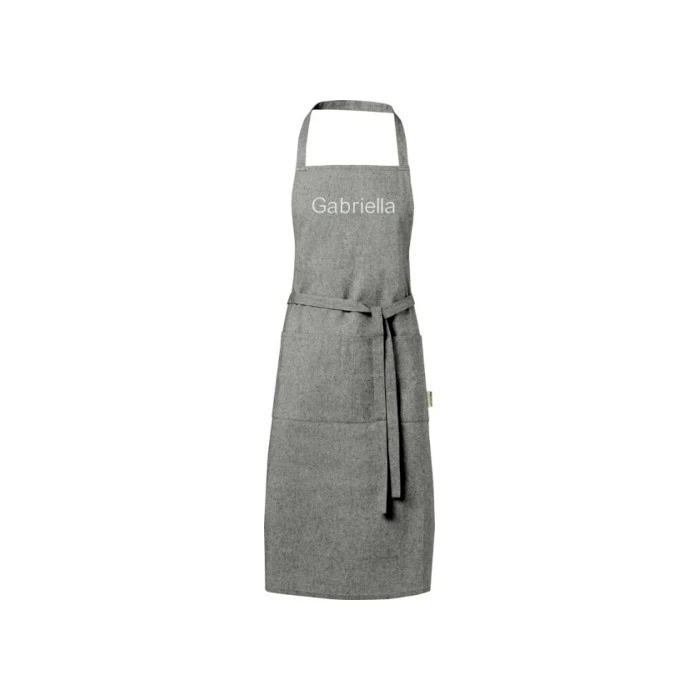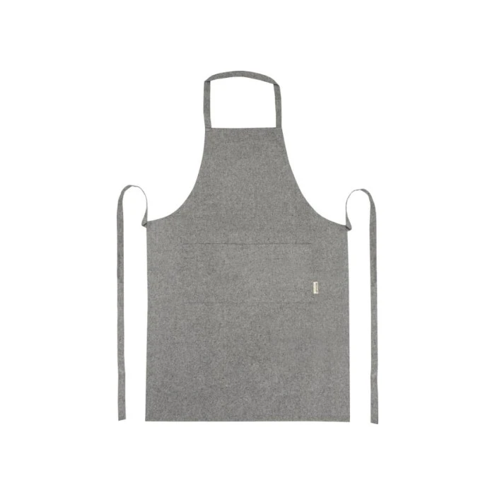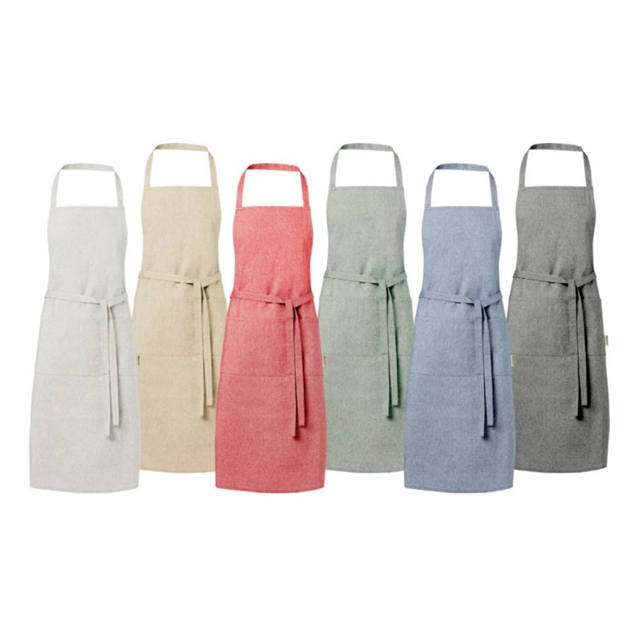 Kierrätetystä materiaalista valmistettu esiliina suojaa vaatteitasi keittiössä. Esiliinassa kaksi vierekkäistä taskua, joiden yhteiskoko on 45 x 20 cm ja metrin pituiset sidontanauhat. Niskahihnan pituus: 55 cm. Saatavilla 6 meleeratussa värissä. Valmistettu 80 % kierrätetystä puuvillasta ja 20 % kierrätetystä polyesteriseoksesta, 200 g/m².