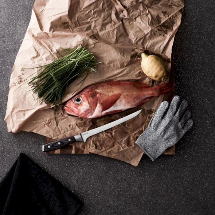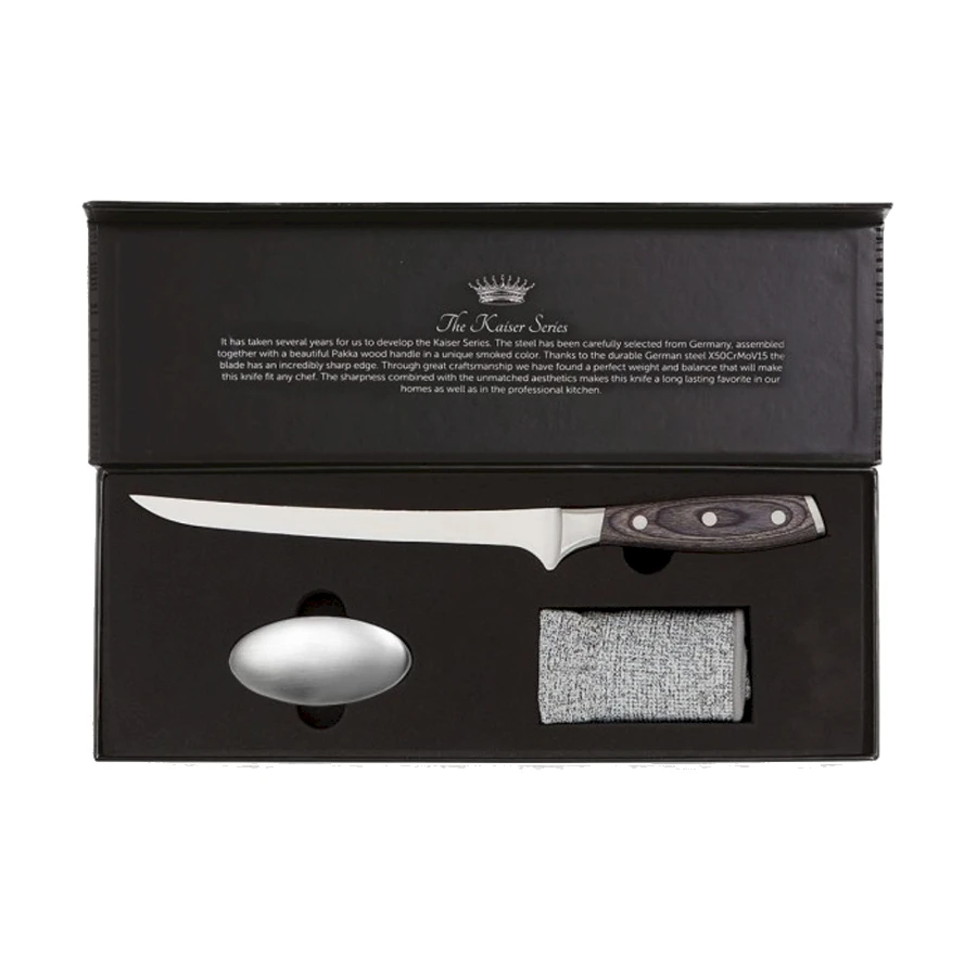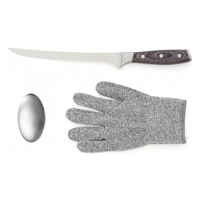 Täydellisessä kalankäsittelysetissä on fileerausveitsi, teräskudottu suojakäsine ja metallisaippua. Metallisaippua poistaa käsistä mm. kalan ja sipulin hajut. Käsineen avulla saat kalasta pitävän otteen ja se suojaa kättäsi veitsen viillolta. Veitsi on valmistettu saksalaisesta laatuteräksestä (X50CrMoV15) ja sen kahva on kestävää ja kaunista Pakkawoodia. Kahvasta saa hyvän otteen, veitsi on tasapainoinen ja leikkaa erittäin hyvin. Pakattu lahjalaatikkoon.