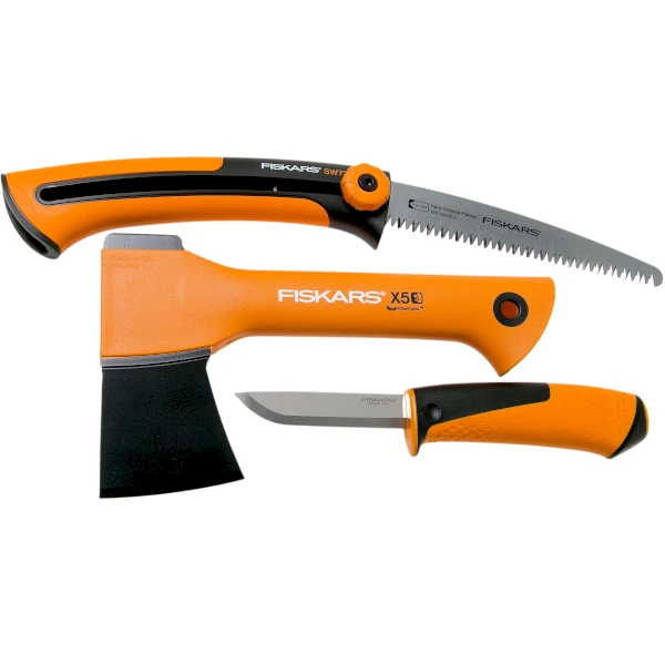 Fiskars Retkeilijän setti sisältää tarvittavia tuotteita niin metsävaellukselle kuin pienempiin lähimetsäseikkailuihin. Settiin kuuluu Fiskarsin X5-retkikirves, puukko muovitupella ja sormisuojalla sekä Xtract puutarha- ja retkisaha.