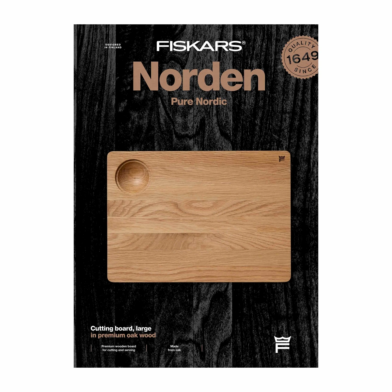 Käsityöperinteistä ja vankasta ammattitaidosta ammentavan Fiskars Norden -sarjan juuret ovat syvällä Pohjolan maaperässä. Myös sarjan keittiövälineet on valmistettu ensiluokkaisista materiaaleista. Iso Norden-leikkuulauta on laadukasta vaaleaa tammea, joka kestää aikaa ja käyttöä ja on tyylikäs. Puu materiaalina pitää veitset terävinä pidempään ja on kaunis niin leikatessa kuin tarjoillessakin. Lisäksi leikkuulaudassa on nostamista helpottavat reunat. Voi käyttää yhdessä pienen Norden-leikkuulaudan kanssa. Integroituun kulhoon voi kerätä hienonnetut yrtit tai muut pienet ruoka-aineet kokatessa ja tarjoillessa. Leikkuulaudan aukkoon voi halutessaan laittaa myös Norden-veitsenteroittimen. Muiden Norden-sarjan keittiövälineiden tavoin leikkuulauta sopii täydellisesti moderniin keittiöön.