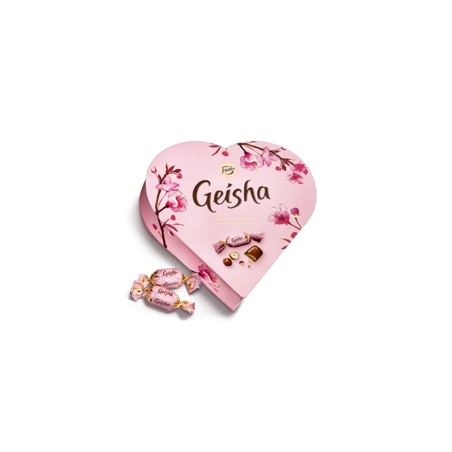 Sydämellisin suklaalahja ystävänpäivään! Kaunis Geisha hurmaa vuodesta toiseen. Suloisen hurmaava suklaaherkku löytyy suosituimmasta sydämenmuotoisesta rasiasta. Tuttu ihana suklaan maku sopii moneen herkkuhetkeen ja lahjaksi.