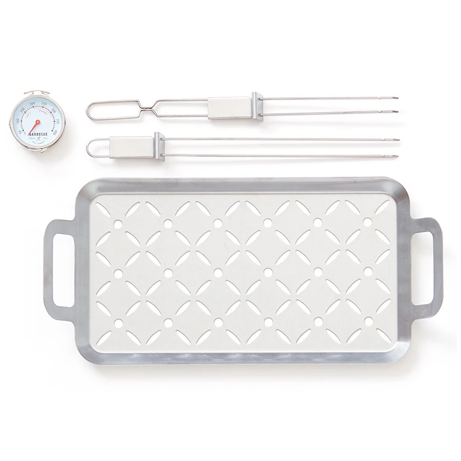 Täydellinen grillisetti, joka sisältää ruostumattomasta teräksestä valmistetun grillausalustan, kaksi grillivarrasta ja pintalämpömittarin. Kattava setti, joka sopii kaikkeen grillaukseen. Toimitetaan hienossa lahjalaatikossa reseptivihkon kanssa. Koko: grillausalusta 19 x 40 cm (sis. kahvat), grillivartaat 32,5 x 3 x 3 cm, lämpömittari 5,5 x 2 cm.