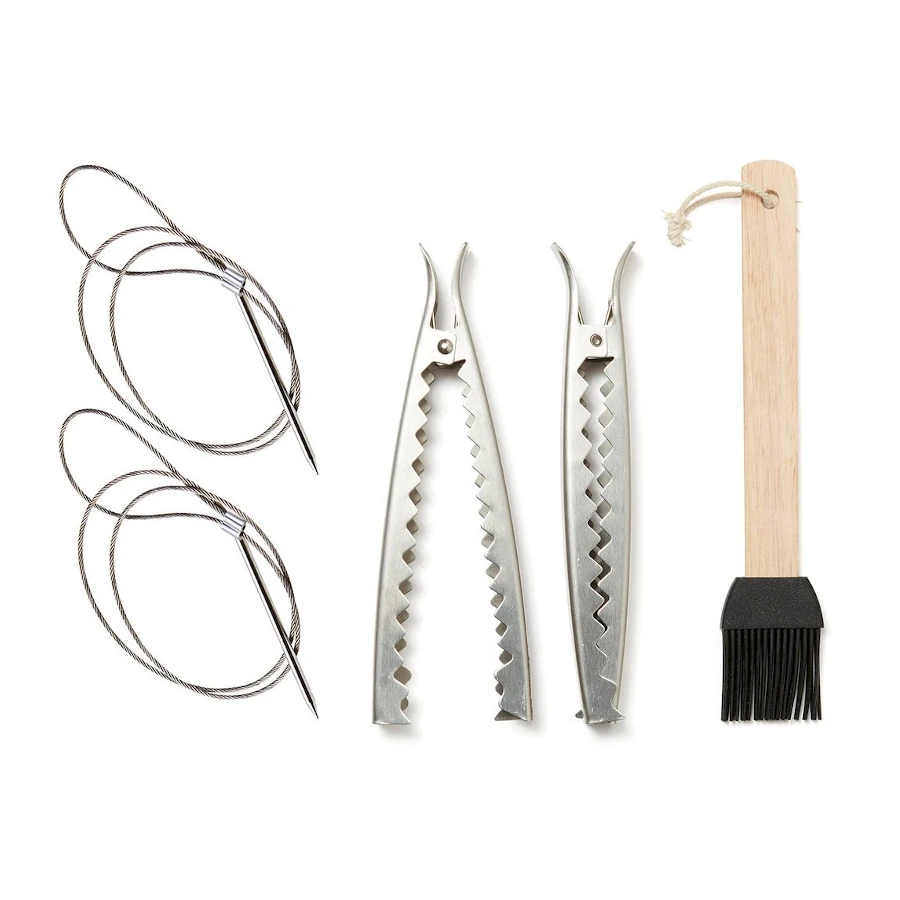 Grillisetti, jossa kaksi grilliklipsiä ja kaksi joustavaa grillivarrasta sekä marinadisuti silikoniharjaksilla. Nakit ja parsat pysyvät paikoillaan klipseissä eivätkä putoa. Vartaat on helppo sijoittaa grillille. Myös puhdistaminen on yksinkertaista. Mainio kesälahja. Lahjapakkaus.