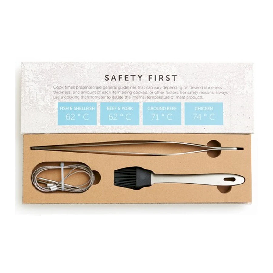 Pinsettimallisia pihtejä on erittäin näppärä käyttää ja tuntuma lihojen ja lisukkeiden käsittelemiseen on hyvä. Settiin kuuluu myös marinadisuti sekä grillivarrasvaijeri. Metalliosat ovat ruostumatonta terästä ja ne on kätevä puhdistaa astianpesukoneessa. Pakattu lahjarasiaan.