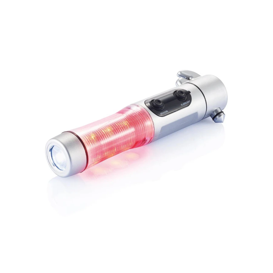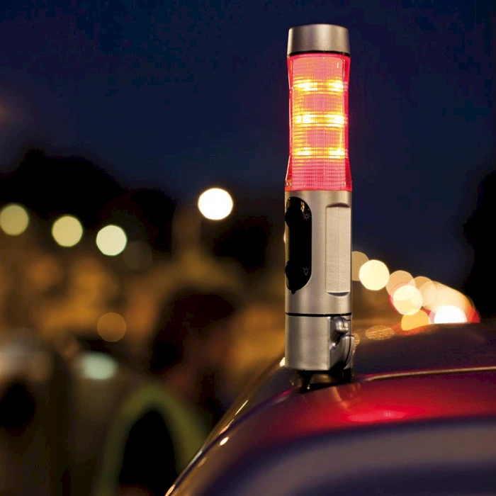 Hätävalo, jossa 1 valkoinen LED-lamppu ja 9 punaista vilkkuvaloa, leikkuri, hätävasara auton ikkunan rikkomista varten. Turvalamppu on monipuolinen valonlähde ja apuväline kiperiin tilanteisiin. Voidaan kiinnittää auton kattoon magneetilla. Sisältää 2 AAA-paristoa. Koko 19,5 x 7 x 4 cm.