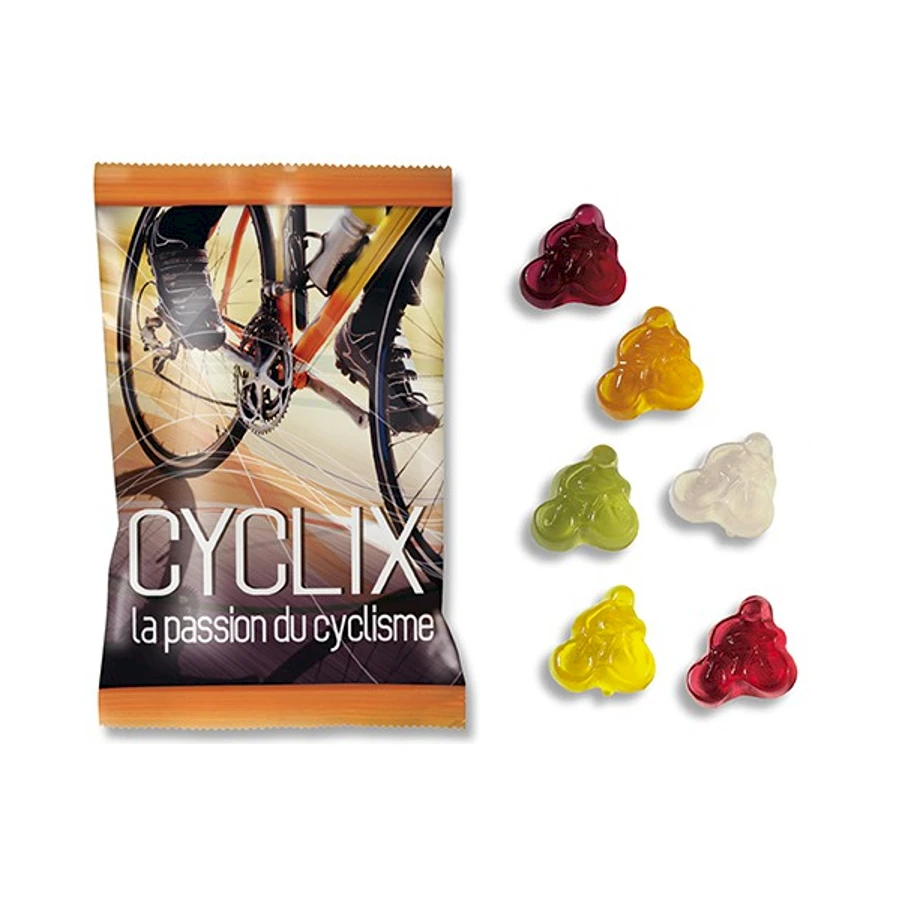 Oman muotoisia pehmeitä nallekarkkeja logopainetussa makeispussissa. Pussin sisällä on pehmeitä ja pirteän makuisia hedelmäkarkkeja. Pussin sisälle voit valita yrityksesi toimialaan sopivan oman muotoisen pehmeän nallekarkin useista vakiomuotoisista makeisista. Karkkipussi voidaan myös brändätä yrityksen ilmeen mukaisesti. Karkkipussi sopii hyvin messuille ja muihin tapahtumiin. Karkkipussin materiaali voi olla valkoinen, läpinäkyvä tai ekologista kompostoituvaa materiaalia. Laadukkaat hedelmäkarkit ovat IFS sertifioituja.
