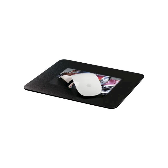 Hiirimatto ikkunalla. Hiirimaton sisälle mahtuu 10 x 15 cm valokuva tai monivärinen mainosviesti. Hiirimaton koko 23 x 19 cm. Väreina musta, valkoinen ja sininen. Pyydä tarjous omasta toteutuksesta.