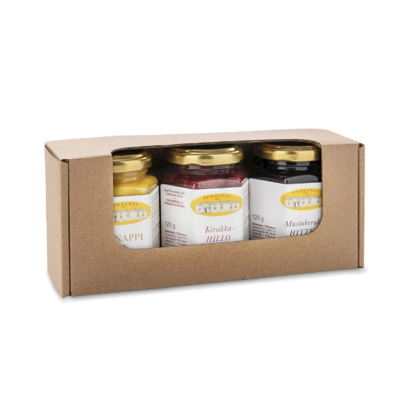 Lahjapakkauksen tuotteet: sinappi 110 g, kirsikkahillo 125 g ja mustaherukkahyytelö 125 g. Säilöntäaineeton, ei lisättyjä väriaineita.