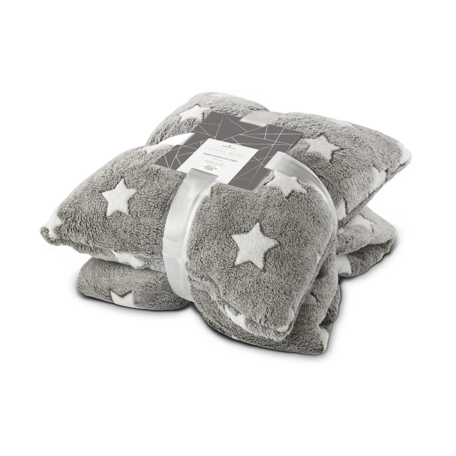 Runsaan pehmeä Stars lahjasetti sisältää lämpimän tähtihuovan ja tähtityynyn. Huopa Lämpimän tähtikuviollisen huovan alla on mukava ottaa torkut. Huopa on paksua polyesteriä, painoltaan 250 g/m². Huovan mitat 150 x 200 cm ja tyynyn mitat 45 x 45 cm.Väri: harmaa/tähtikuvioMateriaali: 250 g/m², 100% polyesteri
