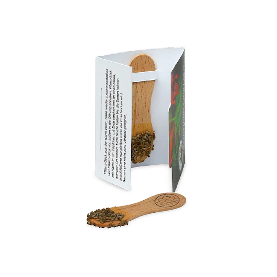 Puinen istutustikku brändätyssä pakkauksessa. Koivusta valmistettu puulusikka, jonka päähän on kinnitetty siemeniä. Työnnä istutustikku maahan, kastele ja anna kasvaa. Pakkaus sisältää puisenlusikan, valitsemillasi siemenillä sekä ohjekortin. Lusikan koko 7 x 1,5 cm, kortin koko 5,5 x 8 cm. Paino 5 g. Logomerkkaus laserkaiverruksena ja digipainatuksena.