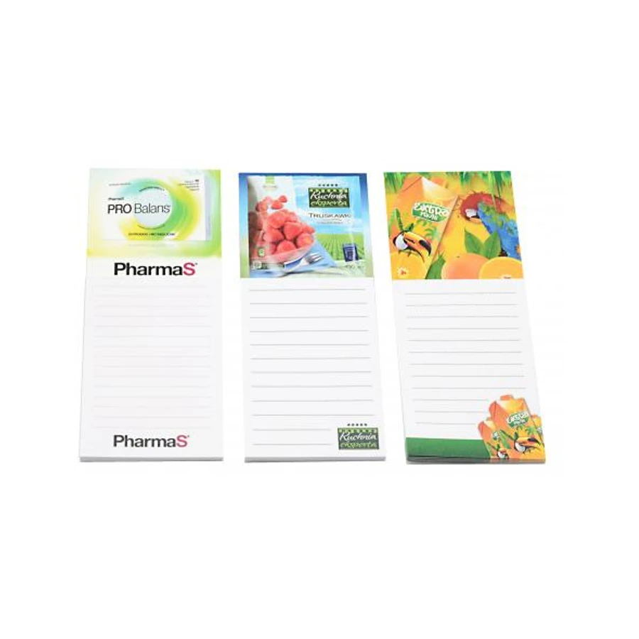 Jääkaappimagneetti muistilehtiöllä. Magneettilehtiössä on 25 valkoista muistilappusivua. Magneettinen ostoslista on käytännöllinen tuote jääkaapin oveen. Saat monivärisen mainospainatuksen magneettiin. Painatus mahdollista myös muistivihkoon. Saatavana useita eri kokoja ja muotoja. Pyydä tarjous omasta toteutuksesta.