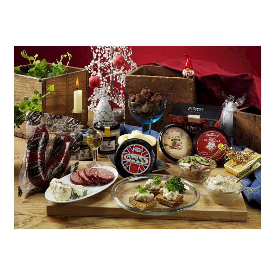 SISÄLTÖ: - Englantilainen whiskycheddar 400 g - Vikenring-savumakkaralenkki 320 g- Sillikaviaari 200 g - Sipulisilli 260 g- Sinappisilli 260 g - Joulusinappi 250 g- Sinihomejuusto 100 g - Tryffelisuklaa 200 g