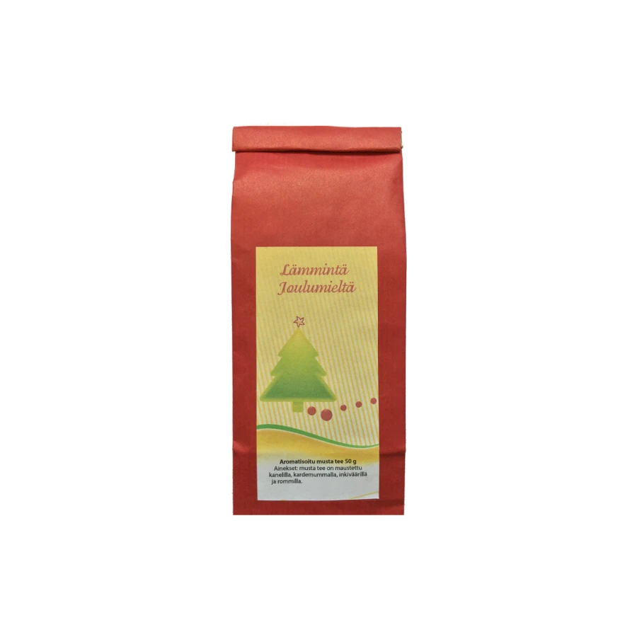 Joulutee omalla etiketillä. Pussin sisällä 50 g aromatisoitua mustaa teetä. Joulutee on maustettu kanelilla, kardemummalla, inkiväärillä ja rommilla. Joulutee voidaan yhdistää muiden tuotteidemme kanssa persoonalliseksi lahjasetiksi. Koko: 17,5 cm x 7 cm, 50 g