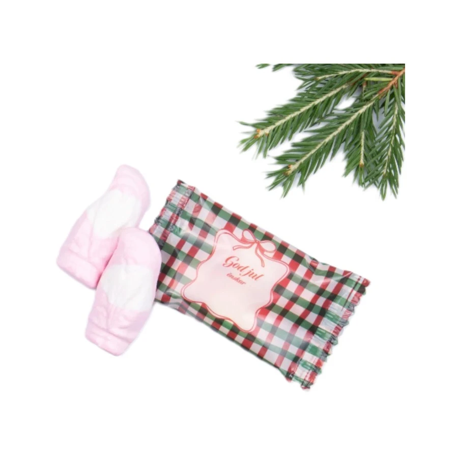 Flow-pakkaus sisältää kaksi (2 kpl) kuohkeaa Joulutonttu vaahtokarkkia. Flow-pakkaus voidaan painaa brändisi mukaisella logolla ja joulutervehdykselllä.