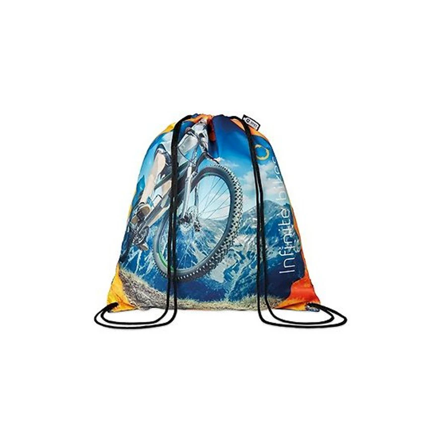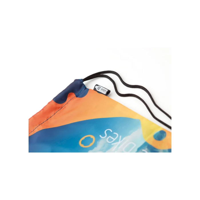 Sublimaatiopainettu rPET Reppu asiakkaan omalla aineistolla. Näyttävä monivärinen painatus voidaan tehdä molemmille puolille reppua. Kevyt rPET jumppapussi on valmistettu kierrätetyistä juomapulloista. Saatavana mustilla kulma vahvikkeilla tai ilman. Jumppapussin sivussa ekologisuudesta kertova rPET etiketti. Pyydä tarjous omasta toteutuksesta.