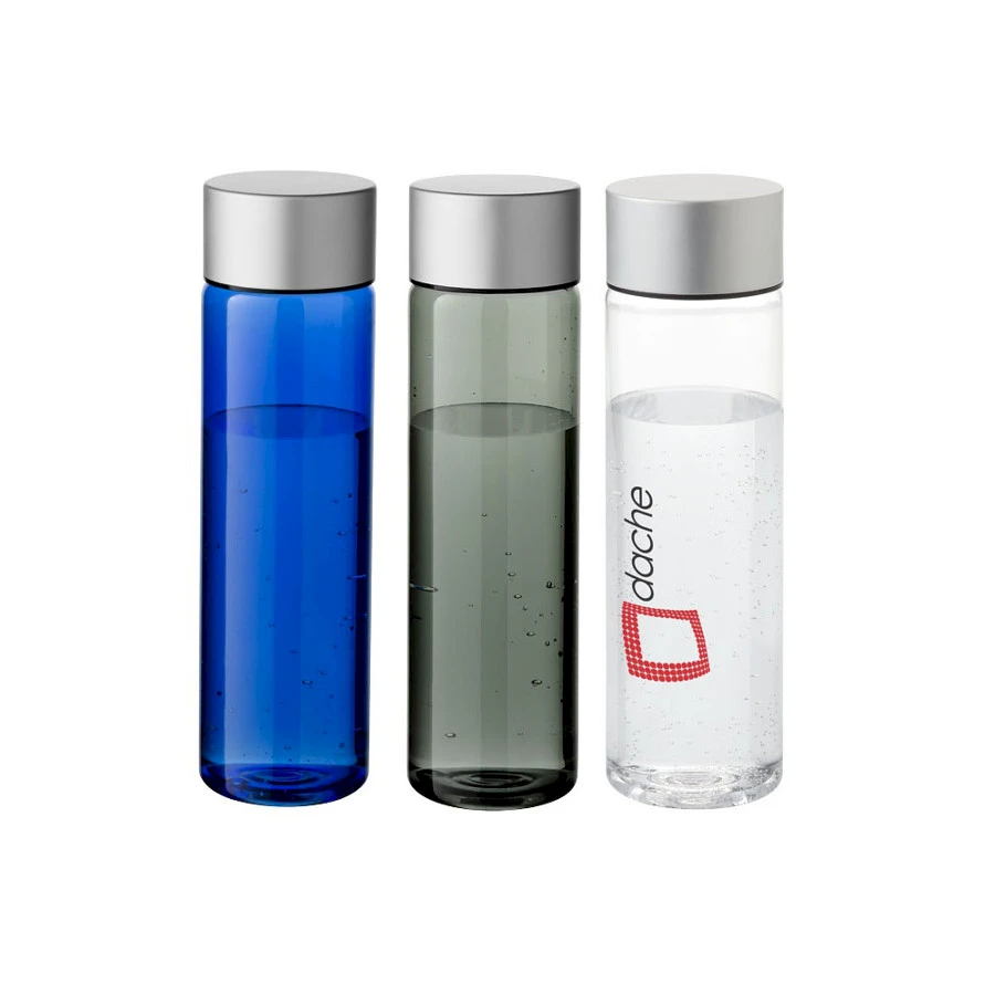 Moderni juomapullo. Vesipullon korkki on terästä ja juomapullo muovia, joten se kestää särkymättä kovassakin menossa. Juomapullossa on kierrekorkki. PVC-vapaa. Pullo on pakattu lahjapakkaukseen. Vesipullo upealla logopainatuksella on raikas ja näyttävä mainostuote. Koko Ø 7,5 x 27 cm.