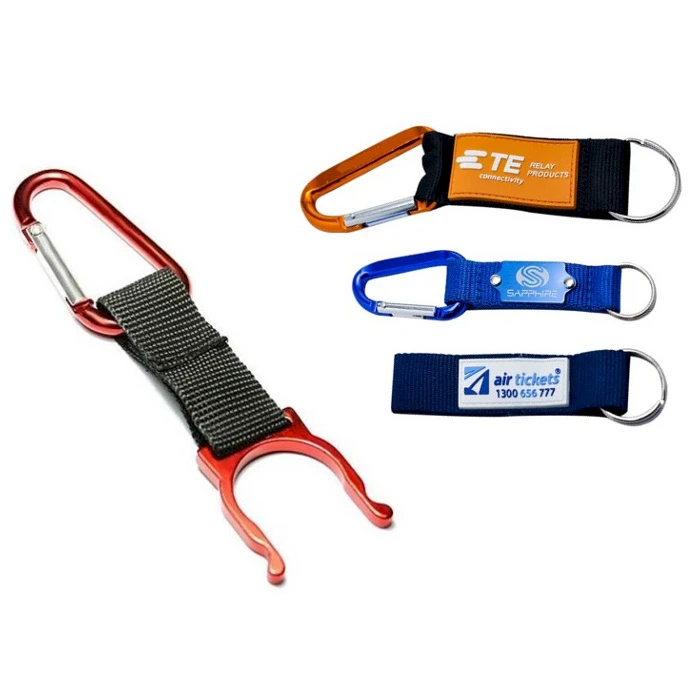 Kätevä juomapullon Hook-kiinnike. Juomapullonkiinnikkeessä on karabiinikoukku, jolla voit kiinnittää vesipullon käsilaukkuusi, reppuusi tai vyötärölle roikkumaan. Karabiinikoukku ja leukapidike on valmistettu kestävästä alumiinista. Pullonpidike sopii standardikokoinen juomapullo. Saatavana useissa eri värivaihtoehdoissa. Voit myös valita nauhan pituuden, värin ja materiaalin. Yrityksesi logo voidaan merkata nauhaan useilla eri menetelmillä. Pyydä tarjous.