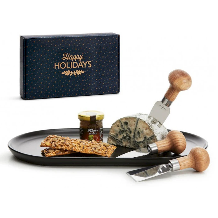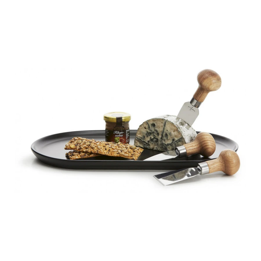 Tämä tyylikäs juustosetti on valmistettu trendikkäistä materiaaleista: tammesta, mustasta kivitavarasta ja ruostumattomasta teräksestä. Kolme juustoveistä ja mattamusta lauta. Kauniin paketoinnin ansiosta sopii täydellisesti lahjaksi.