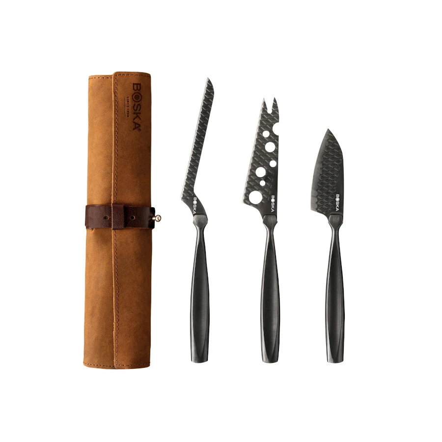 Juustoveitsisetti Monaco. BOSKAn - B Corporation -sertifioidun yrityksen - juustoveitsisarja Monaco+ Black tarjoaa täydellisen leikkausratkaisun kaikenlaisille juustoille pehmeästä Briestä kovaan parmesaaniin. Nämä ainutlaatuiset ruostumattomasta teräksestä valmistetut, tarttumattomat veitset, joissa on aitoa nahkaa oleva suojakotelo, ovat ihanteellinen ja tyylikäs lahja todellisille juuston ystäville ja ruoanlaiton harrastajille. Tämä setti on jääkaappiturvallinen, vain käsin pestävä ja sillä on 10 vuoden takuu.