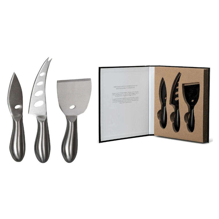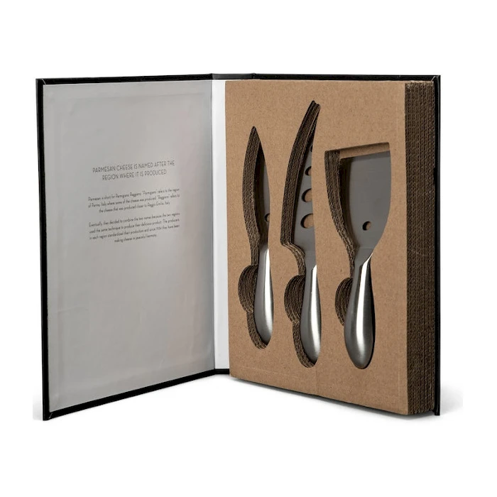 Juustoveitsisetti Formaggio sisältää kolme erilaista juustoveistä. Teräksiset juustoveitset on pakattu kauniiseen kirjalahjalaatikkoon. Suosittelemme käsinpesua.