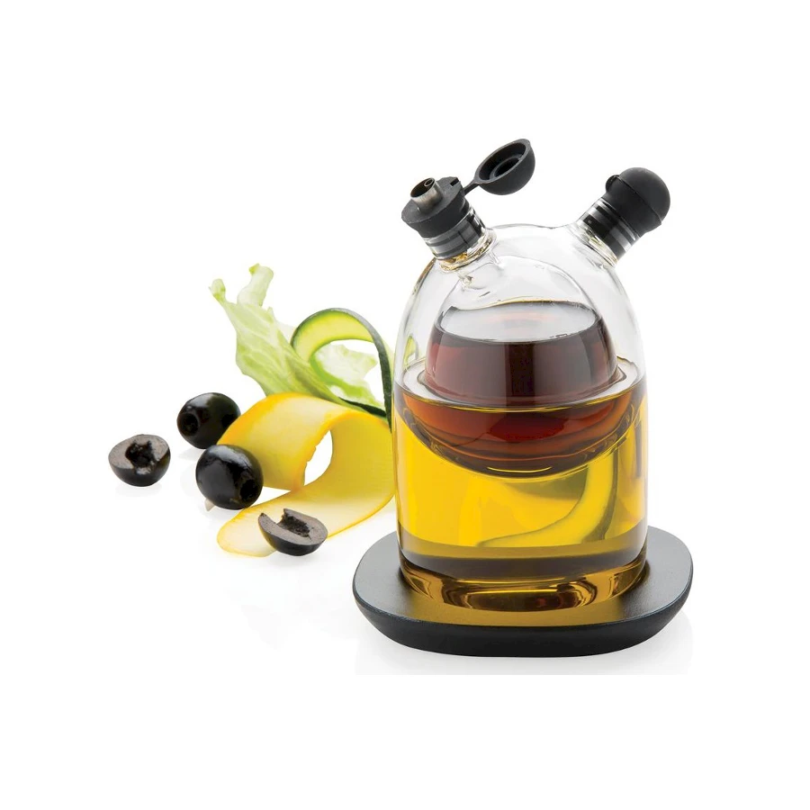 Duo kaadin öljylle ja viinietikalle. Uniikki ovaalinmuotoinen lasikulho öljylle ja viinietikalle suupuhallettua lasia. Duo kaadin on käytännöllinen lasikulho jossa on 2 erillistä säiliötä kastikkeille: 60 ml ja 140 ml säiliöt. Osioilla on erilliset kaatimet, joten ne pysyvöt erillään.Suosittelemme käsinpesua. Materiaali: lasi/mdfKoko: 12,5 x 7 cm