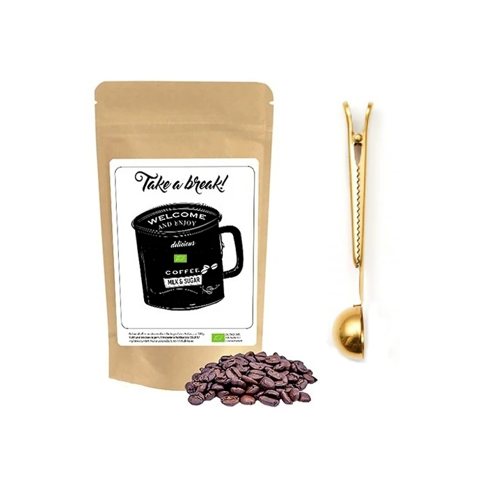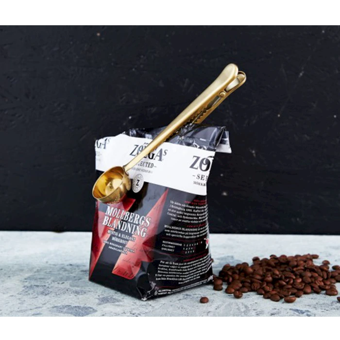 Kullanvärinen kahvimitta. Kätevä tuote jolla mittaat halutun kahvimäärän ja jonka hammaskiinnityksen avulla suljet kahvin aromit pussiin. Anna pienenä muistamisena kullanarvoisille asiakkaillesi tai liitä kahvimittalusikan mukaan vaikka paketti gourmet kahvia. Vastapaahdettu 250 g kahvipussi voidaan personoida omalla etiketillä. Pakattu lahjalaatikkoon. Mitan koko: 17,5 x 3,5 cm