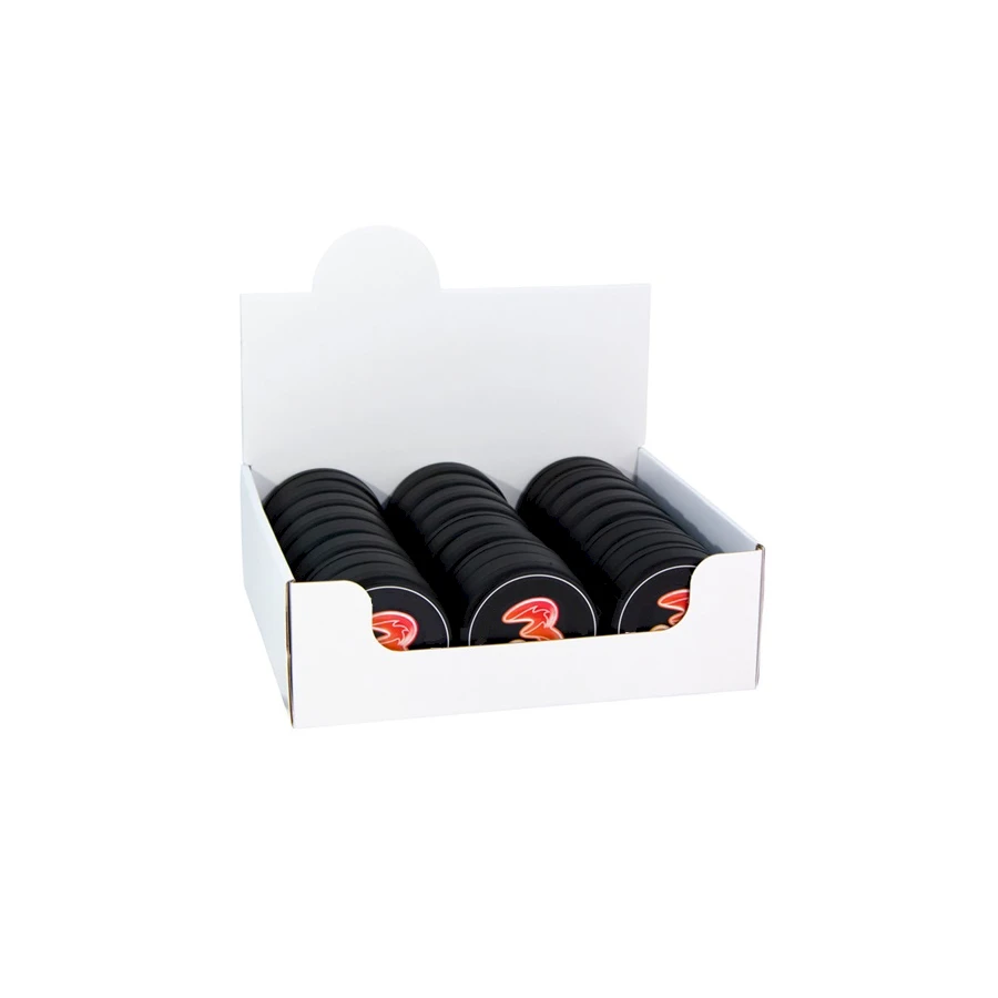 Karkkirasia Hockey. Jääkiekon muotoinen karkkirasia täynnä laatumakeisia valintasi mukaan. Osassa makeisia ei ole käytetty palmuöljyä ja osa makeisista on vegaanisia. Valitse mieleisesi. Saat yrityksesi logon/brändin rasian kanteen. Pakattu displaykartonkiseen rasiaan, jossa 25 kpl jääkiekko makeisrasiaa.