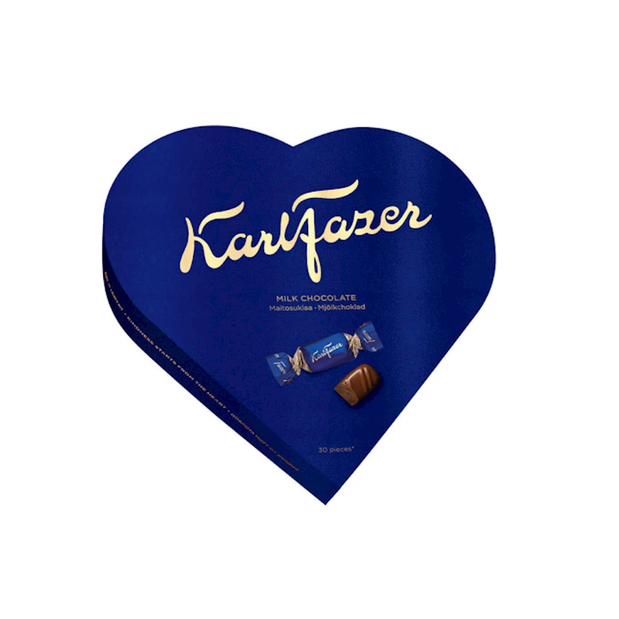 Tämä kaunis sydämenmuotoinen suklaarasia on täydellinen lahja antaa ja saada. Suklaarasia sisältää Karl Fazer kääreellisiä maitosuklaakonvehteja. Kyseessä on Suomen rakastetuin suklaa, jonka ainutlaatuisen täyteläisen maun ovat taanneet parhaat raaka-aineet jo vuodesta 1922. Tunnistat tämän aidosta maidosta valmistetun kansallisaarteemme maun lisäksi myös sinisestä kääreestä, jonka kultainen Karl Fazer allekirjoitus toimii laadun takeena. Mikä parasta, kaikki Fazerin herkulliset suklaat on valmistettu 100 % vastuullisesti tuotetusta kaakaosta.