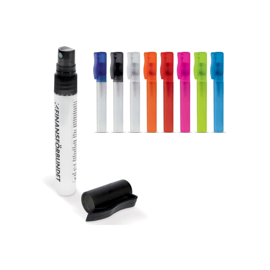 Kynän mallinen desinfioiva käsispray 8 ml. Kätevä pieni käsiendesinfiointisuihke sisältää alkoholia, aloe veraa ja vitamiini E:tä. Painopinta-ala 10 x 40 mm. Värit: musta, sininen, valkoinen, oranssi, punainen, pinkki, lime, v.sininen.Koko: Ø 18 x 125 mm, 18 g