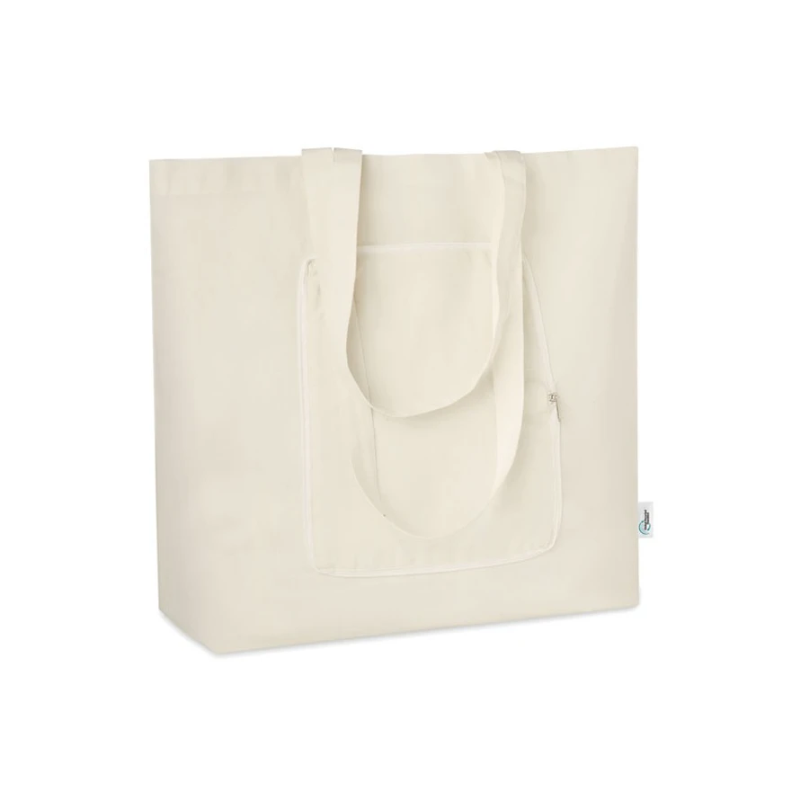 Kokoontaiteltava ostoskassi kierrätyspuuvillasta ja juomapulloista. Kierrätysmateriaaleista valmistetun kassin saa taiteltua pieneksi pussukaksi jonka voi sulkea vetoketjulla. Kokoontaitettava kassi on GRS (Global Recycled Standard) sertifioitu ja vastuullisesti valmistettu.
