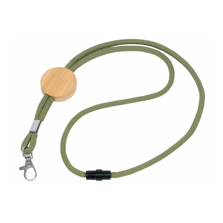 Puuvillasta valmistettu kaulanauha turvalukolla ja bambusoljella. Saat yrityksesi logon kaiverruksella tai painatuksella solkeen.