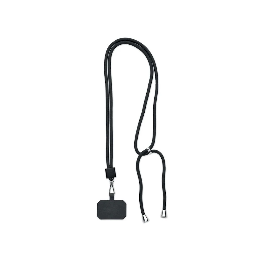 Tyylikäs kaulanauha puhelimelle. RPET kierrätysmateriaalista valmistettu musta säädettävä pyöreäreunainen nauha on mukava iholla. Logosi voidaan merkata mustaan solkeen tai puhelinläpsykkään. Kiinnitä puhelimesi kaulanauhaan läpsykän avulla. Nauhan pituus 150 cm.