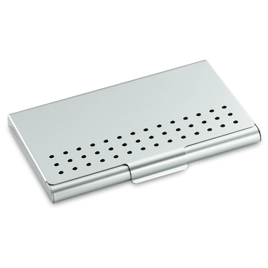 Käyntikorttikotelo on varma tapa pitää käyntikortit siistinä ja edustavina. Sääilytä omat käyntikorttisi kotelossa valmiina eteenpäin annettaviksi sekä saadut yhteystietosi säilyvät hyvässä tallessa. Kotelon materiaali on himmeäpintaista hopean väristä alumiinia. Materiaali: alumiini. Koko 93 x 63 x 8 mm, 17 g