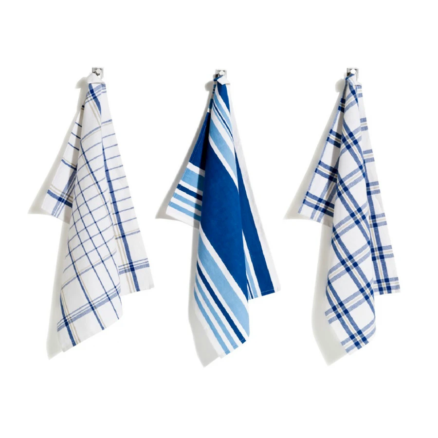 Keittiöpyyhesetti jossa 3 kpl raikkaan sinivalkoista keittiöpyyhettä. Pyyhkeet ovat 100 % puuvillaa. Koko 50 x 70 cm. Kolme pyyhettä on pakattu kiristysnyörillä suljettavaan puolipellavapussiin. Öko-Tex standardin mukaisia turvallisia ja laadukkaita tekstiilejä.