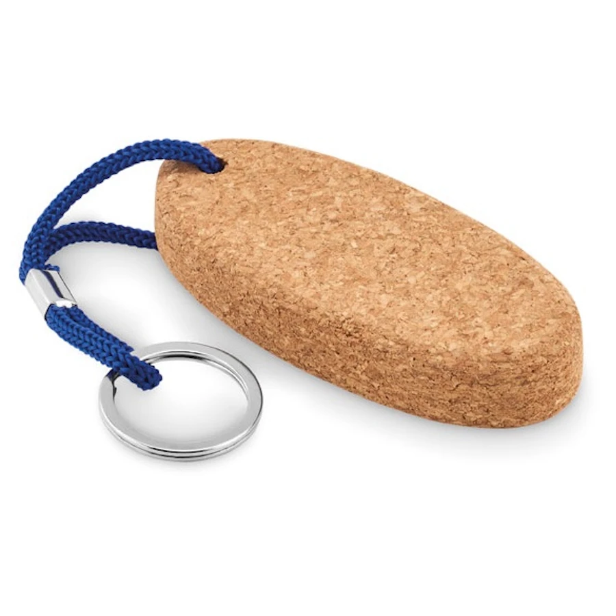 Kelluva avaimenperä Cork. Ovaalin muotoinen avaimenperä on valmistettu korkista ja siinä on punottu naru ja metalli kiinnityslenkki. Saat yrityksesi maonospainatuksen avaimenperään.