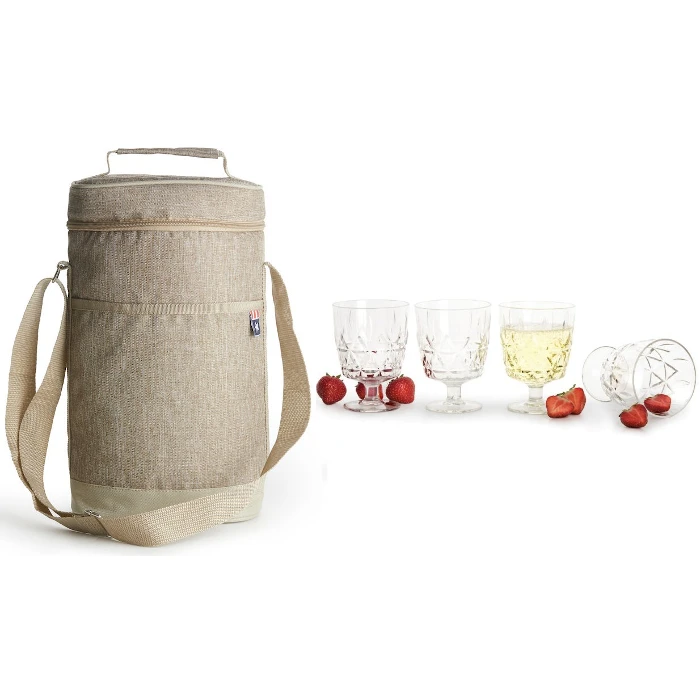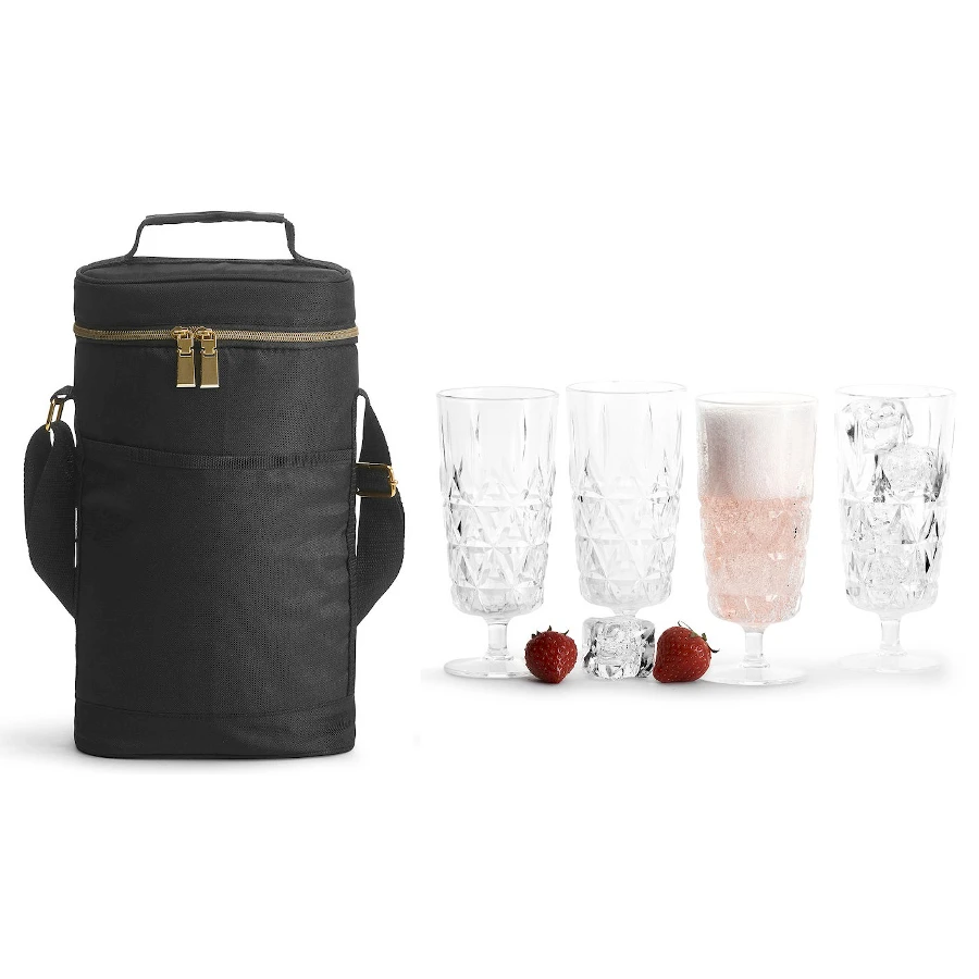 Tyylikäs ja ylellinen lahjasetti, johon kuuluu neljä akryylimuovista valmistettua jalallista lasia ja korkea musta kylmälaukku, jossa kullanväriset yksityiskohdat. Kylmälaukkuun mahtuu kaksi 75 cl:n pulloa. Lasivaihtoehdot: Picnic shamppanjalasi, 4/pakk tai pikniklasi 4 kpl. Kevyet ja kestävät lasit sopivat käytettäväksi kaikkialla. Lasit ovat konepestäviä. Täydellinen setti kesäisille piknikeille!