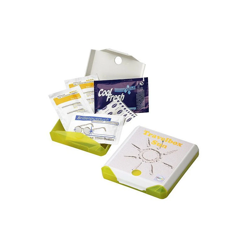 Kätevä pieni kesäpakkaus Sun mukaan mökille, matkalle, retkelle tai festareille. Kesäpakkaus sisältää 2 kpl aurinkovoidetta, kosteuspyyhkeen, vettä hylkivän laastarin, silmälasien- puhdistuspyyhkeen. Koko 110 x 103 x 24 mm. Saatavana myös muilla sisällöillä kuten - hyönteispakkaus, ensiapupakkaus, festivaalipakkaus, lapsille matkapakkaus, fanituotepakkaus. Pakkauksen päälle voidaan tehdä halutunlainen näyttävä monivärinen painatus. Pyydä tarjous omasta kesäpakkausvaihtoehdosta ja määrästä.