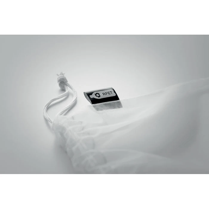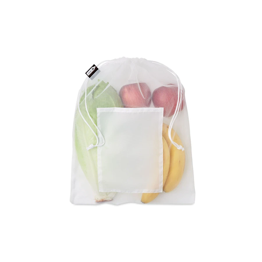 Ympäristöystävällinen kestopussi hedelmille ja vihanneksille. Valkoisessa rPET pussissa on pieni tasku ja kierrätysmerkki. Kestopussi on valmistettu kierrätetyistä juomapulloista valmistetusta polyesteristä. Yrityksesi mainosviesti voidaan painaa silkkipainolla tai digipainatuksella taskuun. Väri: valkoinenMateriaali: rPET polyesteriKoko: 30 x 40 cm