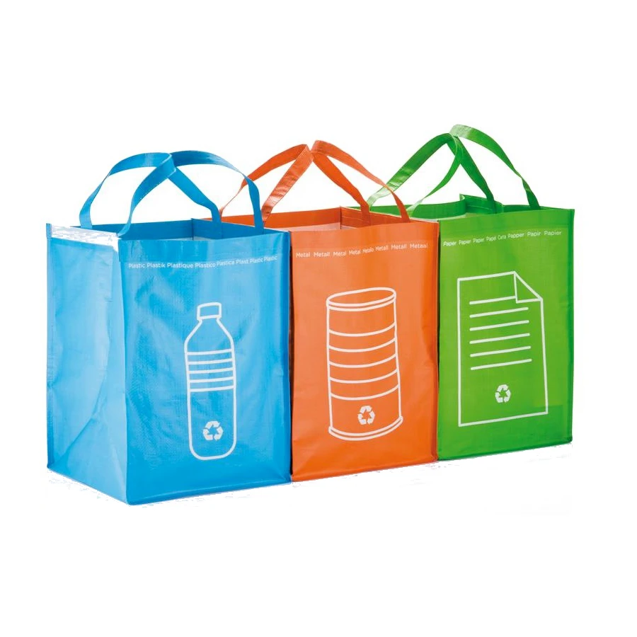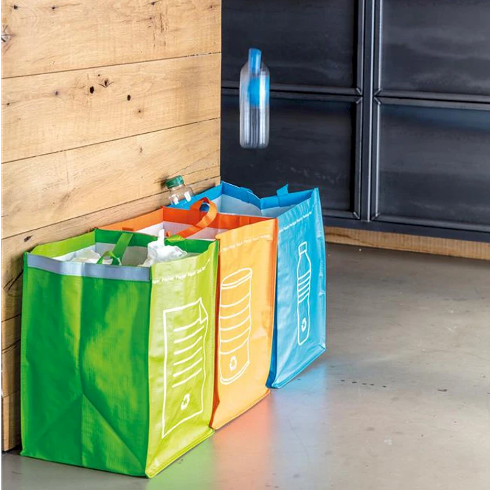 Kierrätyskassisetti, jossa 3 kpl jätteiden lajitteluun tarkoitettua non-woven kassia. Jätteiden kierrätys on helppoa värikkäiden kassien avulla. Kierrätys on mainio arjen ekoteko. Kierrätyskassit kiinnittyvät toisiinsa tarralla, mutta voidaan säilyttää myös erillään. Kasseihin on valmiiksi painettu ikonit, jotka viittaavat metallin, paperin ja pullojen kierrätykseen.